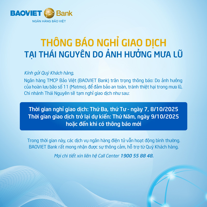 Ngân hàng TMCP Bảo Việt (BAOVIET Bank) trân trọng thông báo: Do ảnh hưởng của hoàn lưu bão số 11 (Matmo), để đảm bảo an toàn, tránh thiệt hại trong mưa lũ, Chi nhánh Thái Nguyên sẽ tạm nghỉ giao dịch như sau: