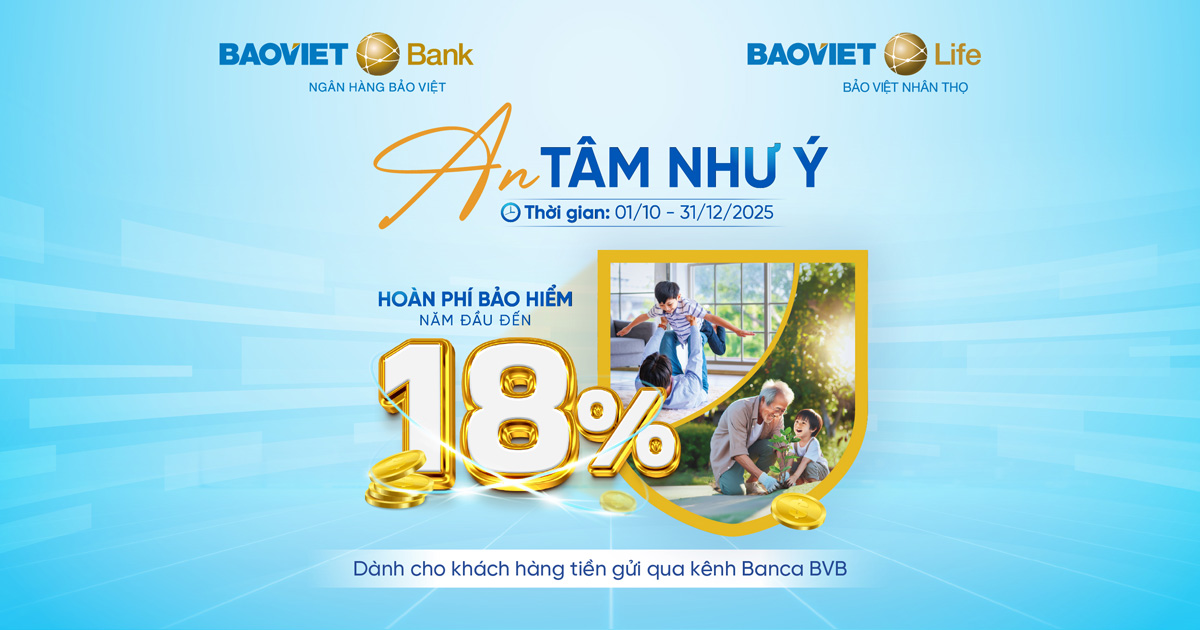 Từ 01/10 – 31/12/2025, BAOVIET Bank tiếp tục phối hợp với Bảo Việt Nhân thọ triển khai chương trình ưu đãi “An Tâm Như Ý – Quý IV/2025” dành cho khách hàng có khoản tiền gửi tại BAOVIET Bank khi tham gia sản phẩm bảo hiểm “An khang như ý” hoặc “An tâm hoạch định” kỳ hạn đóng phí từ 10 năm trở lên.
