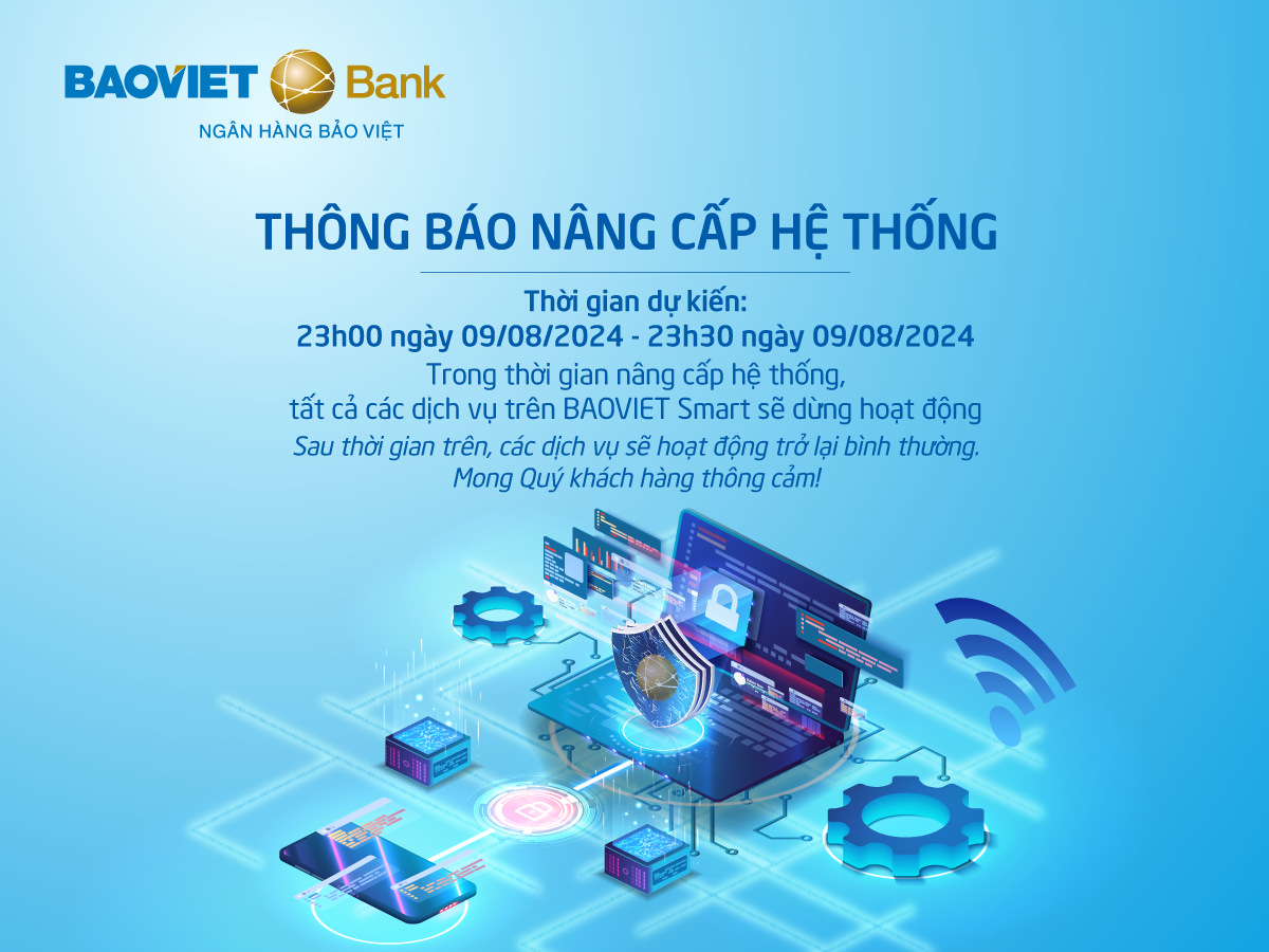 Để bảo trì và nâng cấp hệ thống, BAOVIET Bank trân trọng thông báo đến Quý khách hàng về việc tạm ngừng cung cấp các dịch vụ trên BAOVIET Smart.