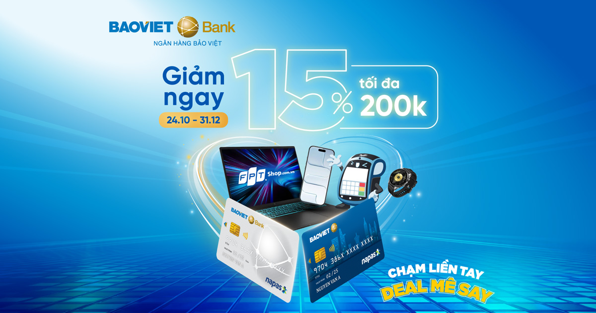 Tận hưởng trải nghiệm mua sắm hiện đại, an toàn và tiết kiệm cùng thẻ BAOVIET Bank tại hệ thống FPT Shop với ưu đãi giảm ngay 15% tối đa 200.000 đồng cho đơn từ 200.000 đồng.