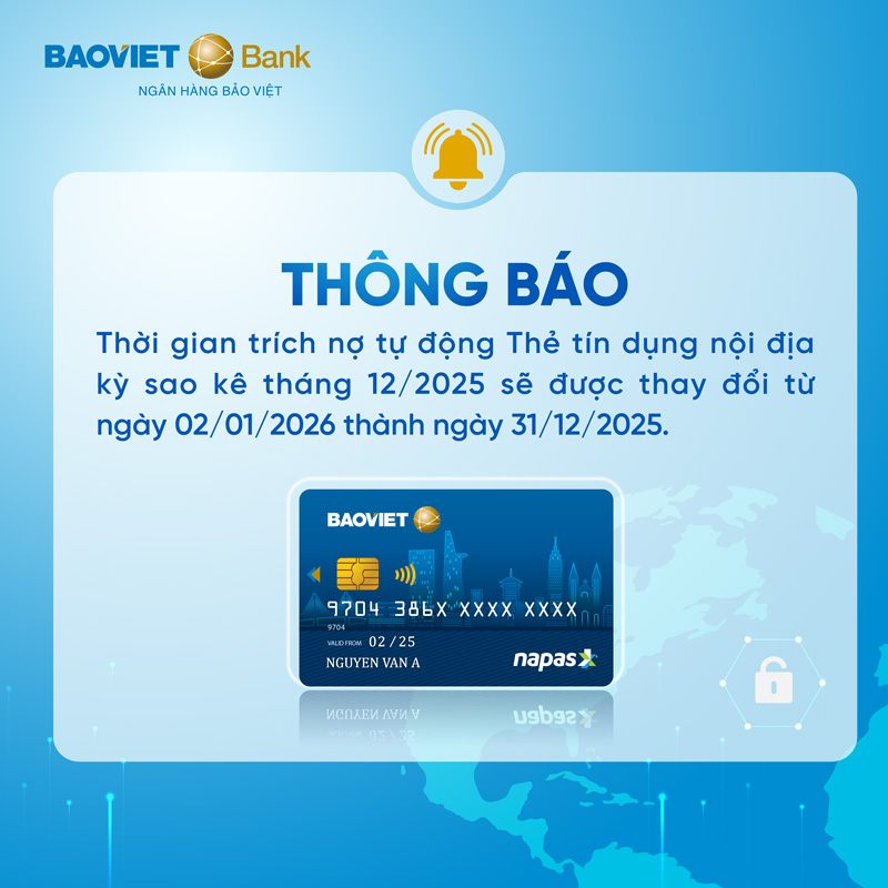 Theo thông báo của Bộ Nội vụ về việc thay đổi lịch nghỉ tết Dương lịch 2026 liên tục 4 ngày từ ngày 01/01/2026 đến hết ngày 04/01/2026, BAOVIET Bank thông báo điều chỉnh thời gian trích nợ tự động Thẻ tín dụng nội địa kỳ sao kê tháng 12/2025 sẽ được thay đổi từ ngày 02/01/2026 thành ngày 31/12/2025. Quý Khách hàng vui lòng bảo đảm tài khoản thanh toán đủ số dư cần thiết để BAOVIET Bank thực hiện trích nợ.