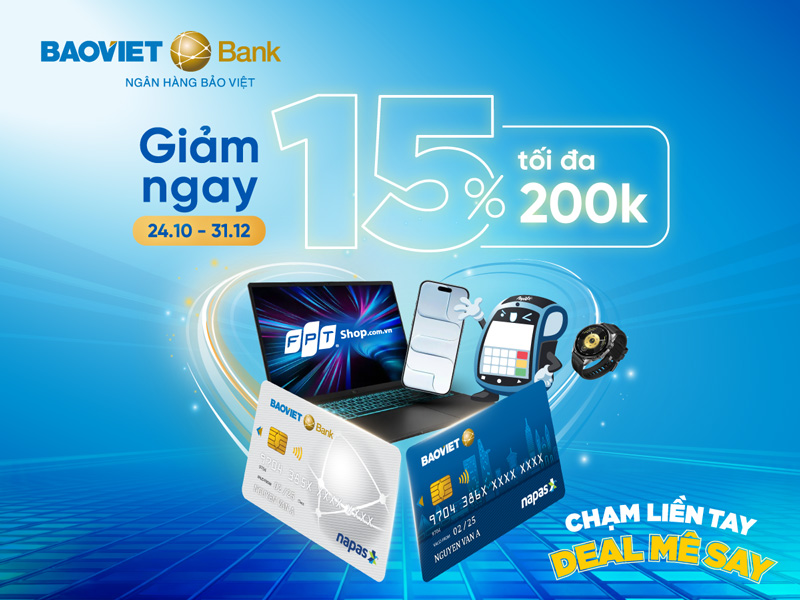 Chỉ với một thao tác chạm nhẹ thẻ ghi nợ nội địa hoặc tín dụng nội địa BAOVIET Bank, khách hàng không chỉ hoàn tất giao dịch trong tích tắc mà còn nhận ngay ưu đãi hấp dẫn cho nhiều dòng sản phẩm như điện thoại, laptop, phụ kiện và thiết bị điện tử… Chương trình diễn ra từ ngày 24/10 đến hết ngày 31/12/2025 tại hệ thống FPT Shop. Nếu đang có ý định mua sắm những món đồ công nghệ mới thì đừng bỏ qua ưu đãi đặc biệt này nhé!