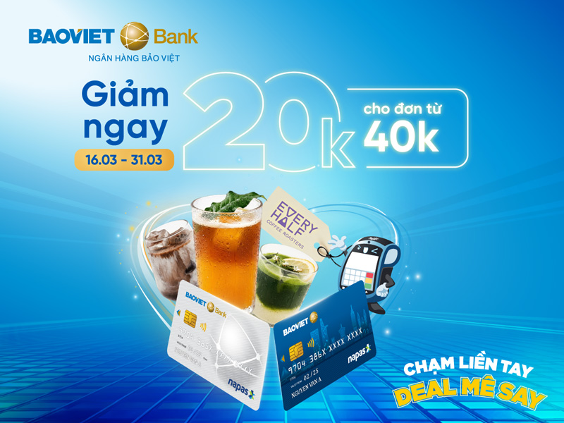 Từ 16/03/2026 đến hết 31/03/2026, khách hàng sẽ được giảm ngay 20.000 đồng cho đơn từ 40.000 đồng khi sử dụng thẻ ghi nợ nội địa hoặc tín dụng nội địa BAOVIET Bank thanh toán trên thiết bị Payoo POS tại các cửa hàng của Every Half Coffee.